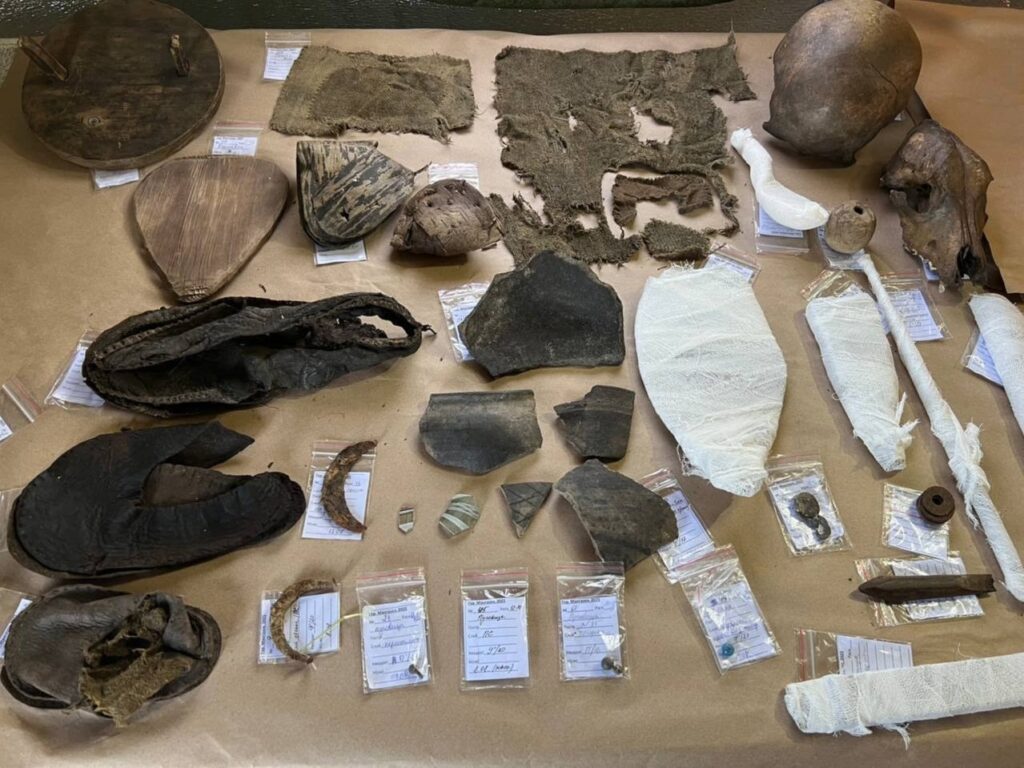 В ходе экспедиции археологи нашли более 1200 индивидуальных находок. Среди них – предметы из дерева, кожи, бересты, ткани, металла и керамики. Найденные артефакты, включая бусины, керамику, ядра для затинных пищалей и монету-«чешуйку» времён царя Михаила Фёдоровича, детально рассказывают о быте и торговых связях «златокипящей» Мангазеи. Особый интерес представляет крышка от флакона для елейного масла, украшенная головами драконов. Это архиерейская символика — флаконы с миром архиепископы выдавали священникам для проведения обрядов крещения.