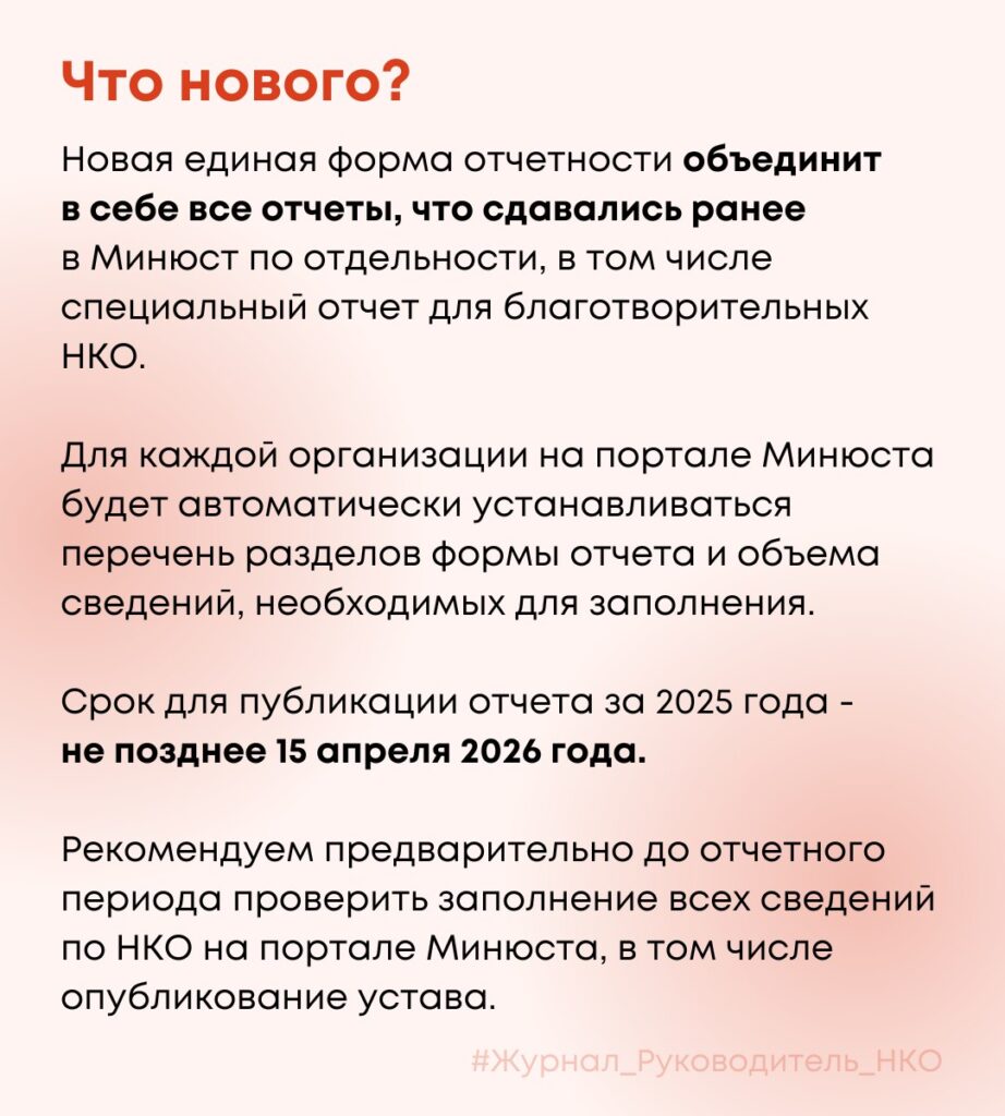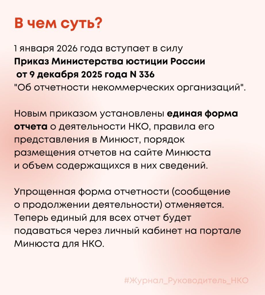 Опубликован Приказ Министерства юстиции России от 9 декабря 2025 года N 336 «Об отчетности некоммерческих организаций», который вступает в силу 1 января 2026 года.